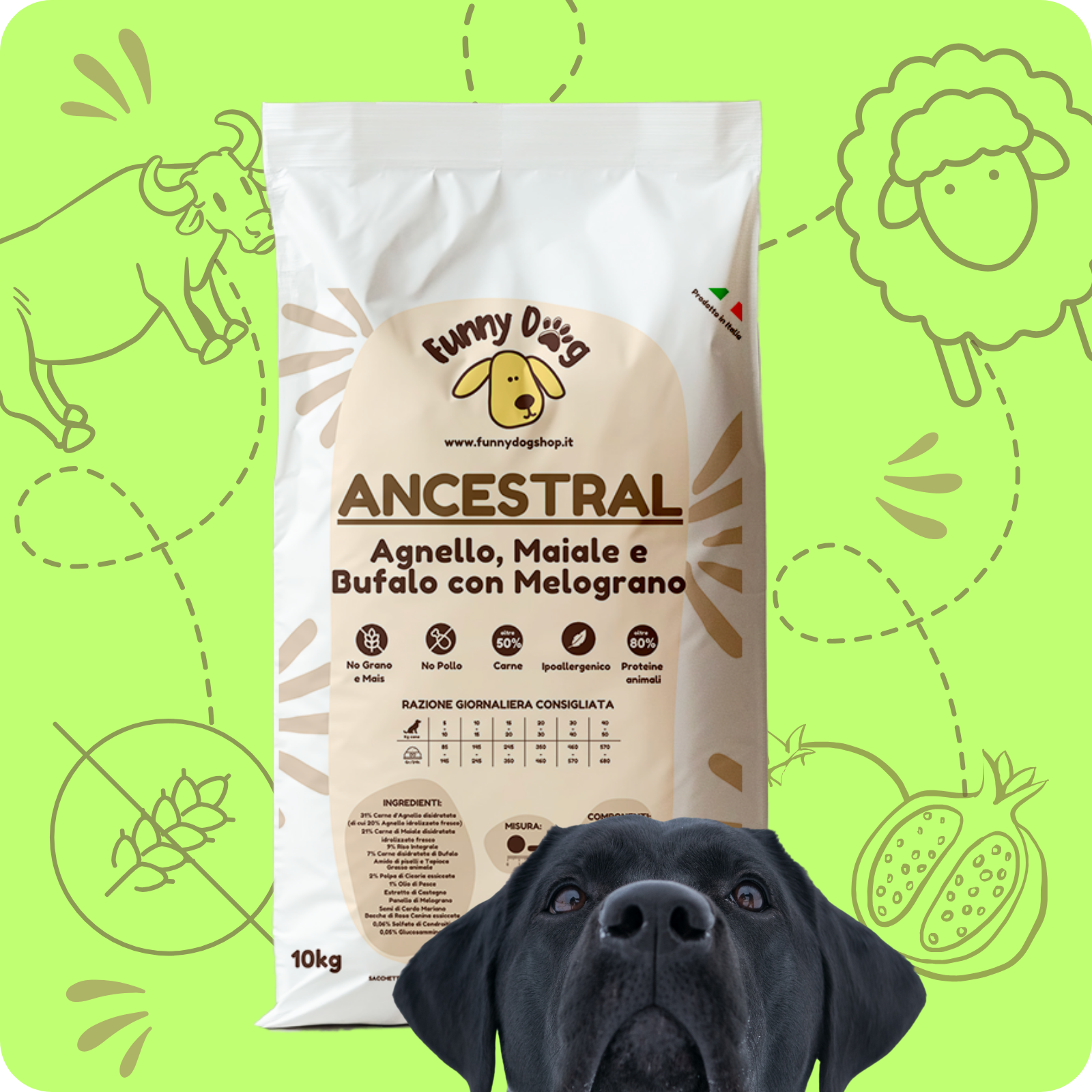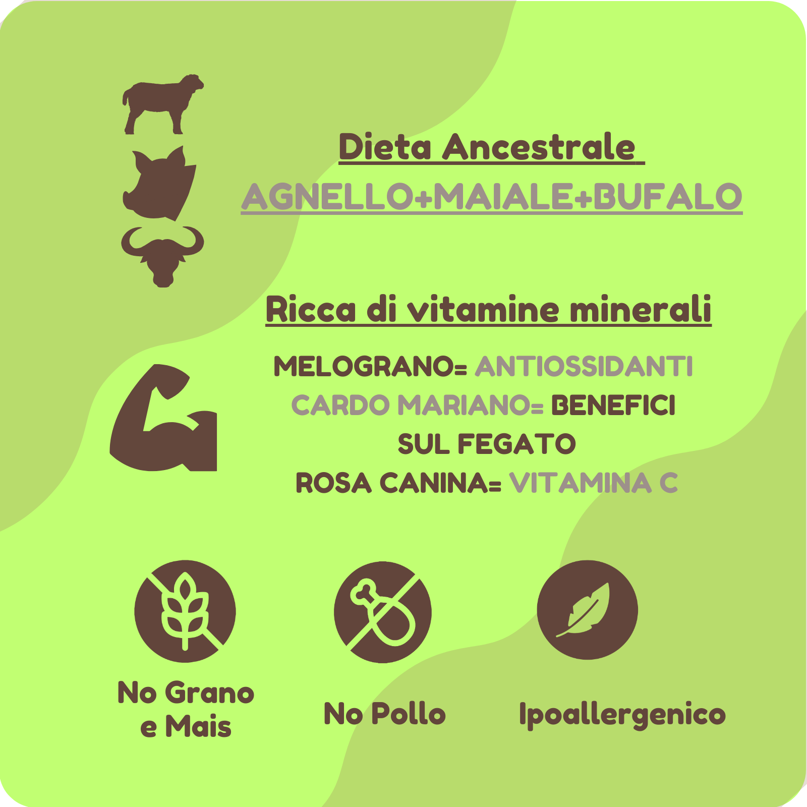 Crocchette ANCESTRAL IPOALLERGENICHE con Agnello, Maiale, Bufalo e Melograno per cani di tutte le taglie