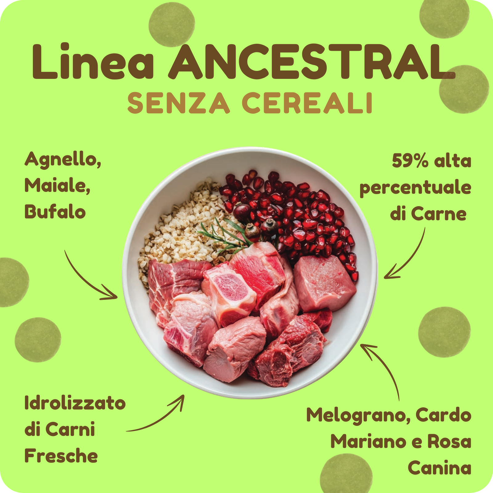 Le Crocchette Ancestral offrono nutrizione canina d'eccellenza con formula evoluzionistica che rispetta l'alimentazione naturale. Contengono 59% di carne e oltre 80% di proteine animali, inclusa carne fresca. Formula ipoallergenica avanzata, senza grano, mais e pollo, ideale per cani sensibili. Arricchite con superfood: melograno (antiossidante), cardo mariano (supporto epatico) e bacche di rosa canina (vitamina C per immunità). Profilo nutrizionale completo con vitamine e minerali bilanciati per garantire vitalità e salute duratura a cani di ogni età e taglia. Nutrizione autentica per benessere, energia e longevità.