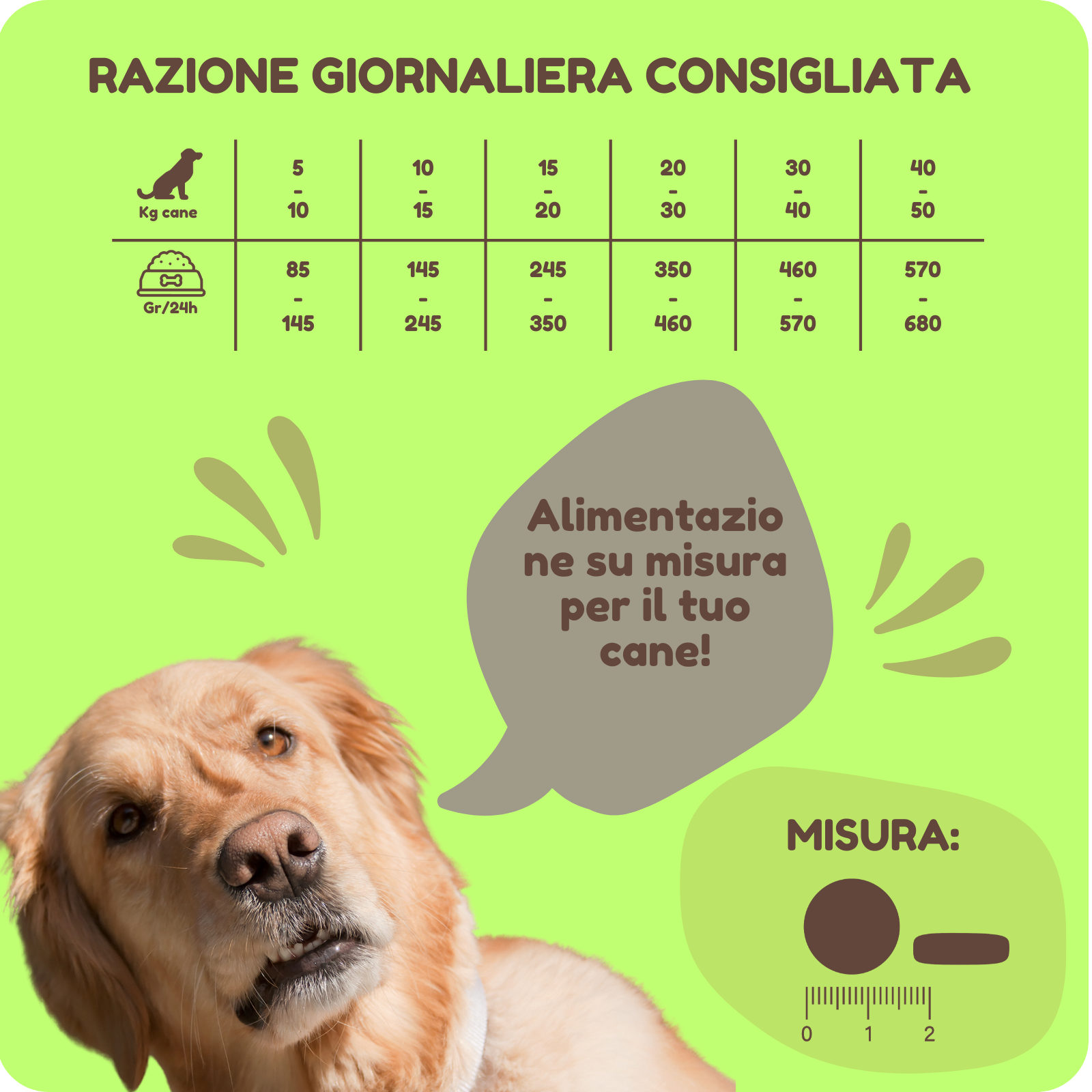 31% Carne disidratata di Agnello (di cui idrolizzato proteico di agnello fresco 20%), 21% Carne disidratata di Maiale idrolizzato fresco, 9% Riso integrale, 7% Carne disidratata di Bufalo, Amido di Piselli, Tapioca, Grasso animale, 2% Polpa di Cicoria essiccata, 2% Polpa di Barbabietola essiccata, 1% Polpa di Carruba essiccata, 1% Olio di pesce, Estratto di Castagno, Panello di melograno, Semi di Cardo Mariano, Bacche di Rosa Canina essiccate, 0.06% di Solfato di Condroitina, 0.05% Glucosammina
