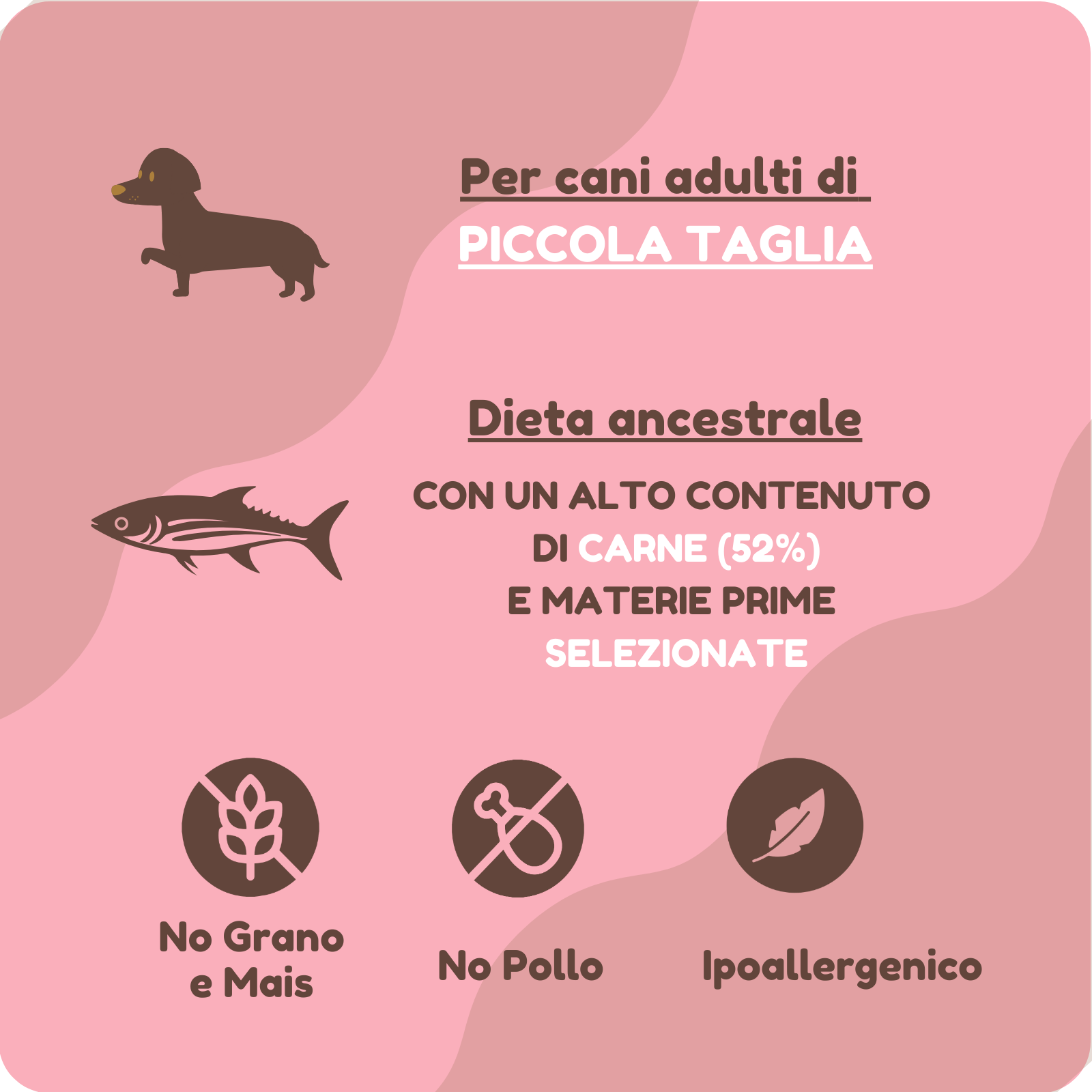 Alimento premium per cani adulti di taglia piccola ispirato alla dieta ancestrale carnivora. Contiene 52% di pesce premium (30% salmone disidratato e 22% aringa disidratata idrolizzata). Formula ipoallergenica senza pollo, grano e mais, con oltre 80% di proteine animali altamente biodisponibili. Crocchette di dimensione ridotta per facilitare masticazione. Arricchito con ingredienti funzionali: polpa di cicoria, barbabietola e carruba (salute intestinale), olio di pesce (pelo lucente), antiossidanti naturali, vitamina C e condroprotettivi. Nutrizione completa per soddisfare anche i palati più esigenti.