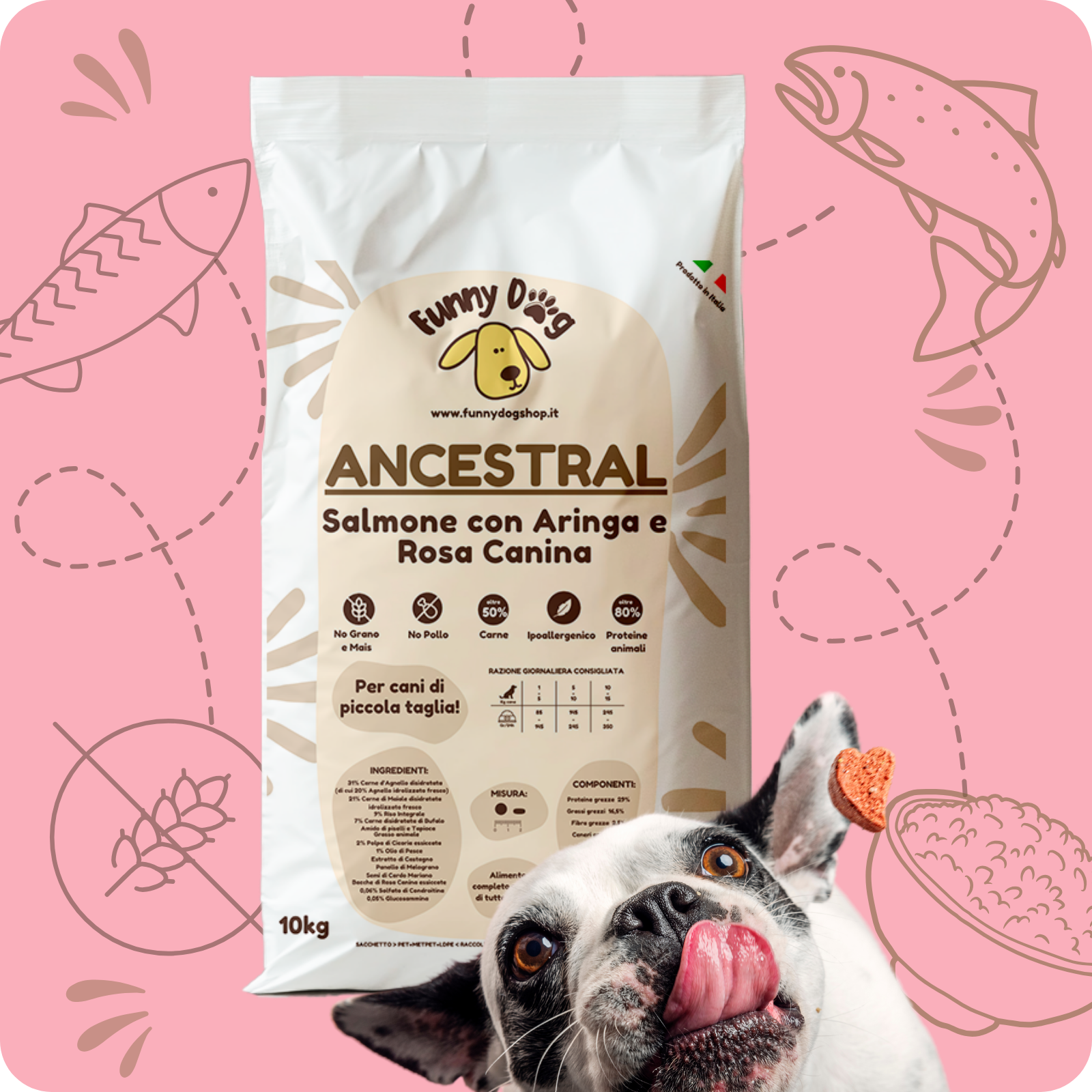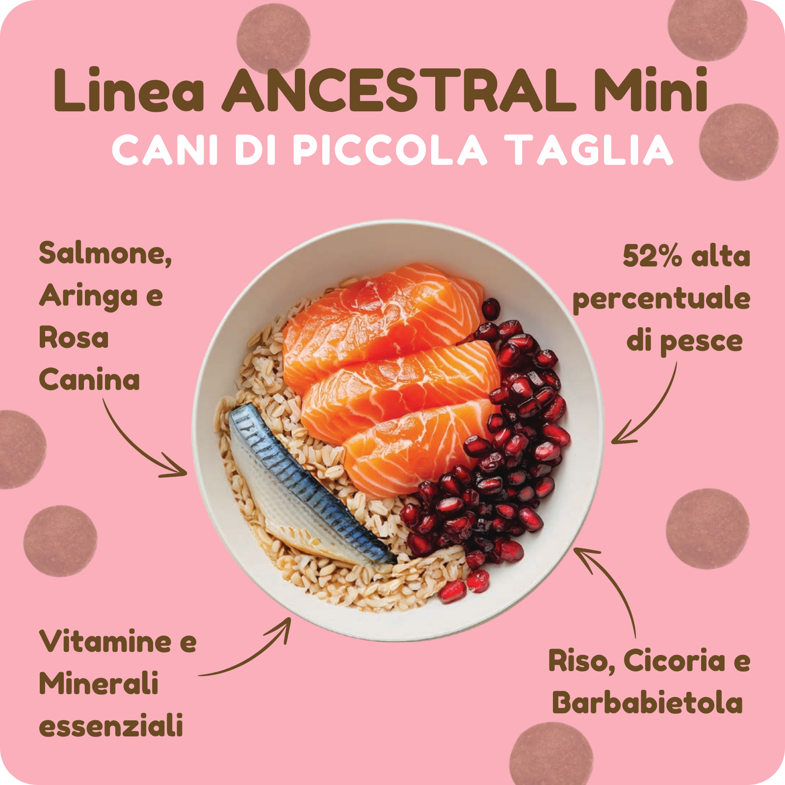 Crocchette ANCESTRAL IPOALLERGENICHE con Salmone, Aringa e Rosa canina per cani di piccola taglia