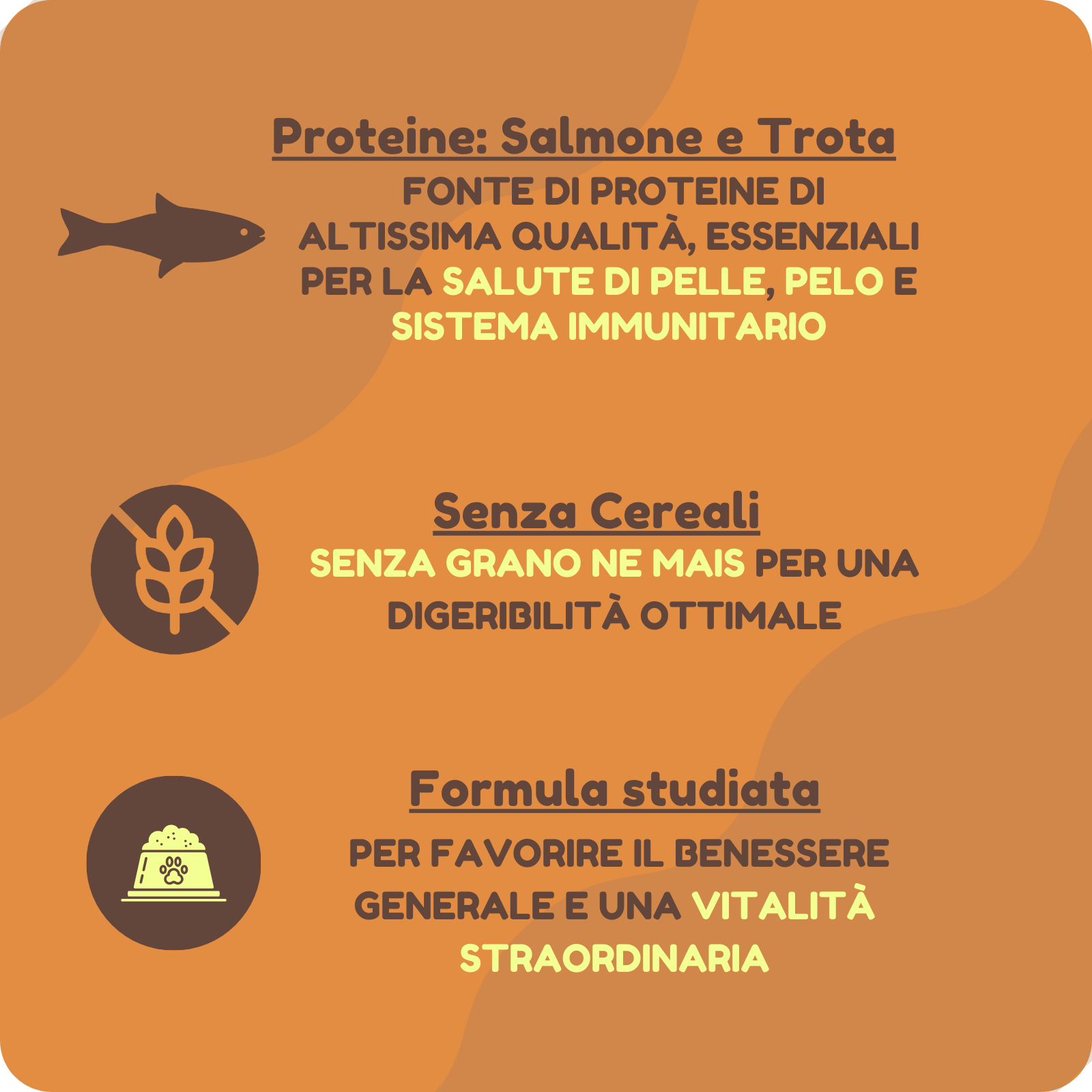 Nutrizione completa grain free con oltre il 60% di materie prime fresche di origine animale e l’85% di proteine animali. La combinazione di salmone e trota offre carni leggere, altamente digeribili e naturalmente ricche di Omega 3. La ricetta è totalmente priva di cereali e pollo, ideale anche per cani sensibili o con intolleranze. L’elevato contenuto di Omega 3, insieme a vitamine e minerali essenziali, sostiene pelle sana, pelo lucente e un sistema immunitario forte. Adatte a cani adulti di ogni taglia, sono preparate senza riempitivi, conservanti artificiali o coloranti. Ananas e melograno completano questa formula esclusiva favorendo una digestione equilibrata, energia duratura e benessere quotidiano.