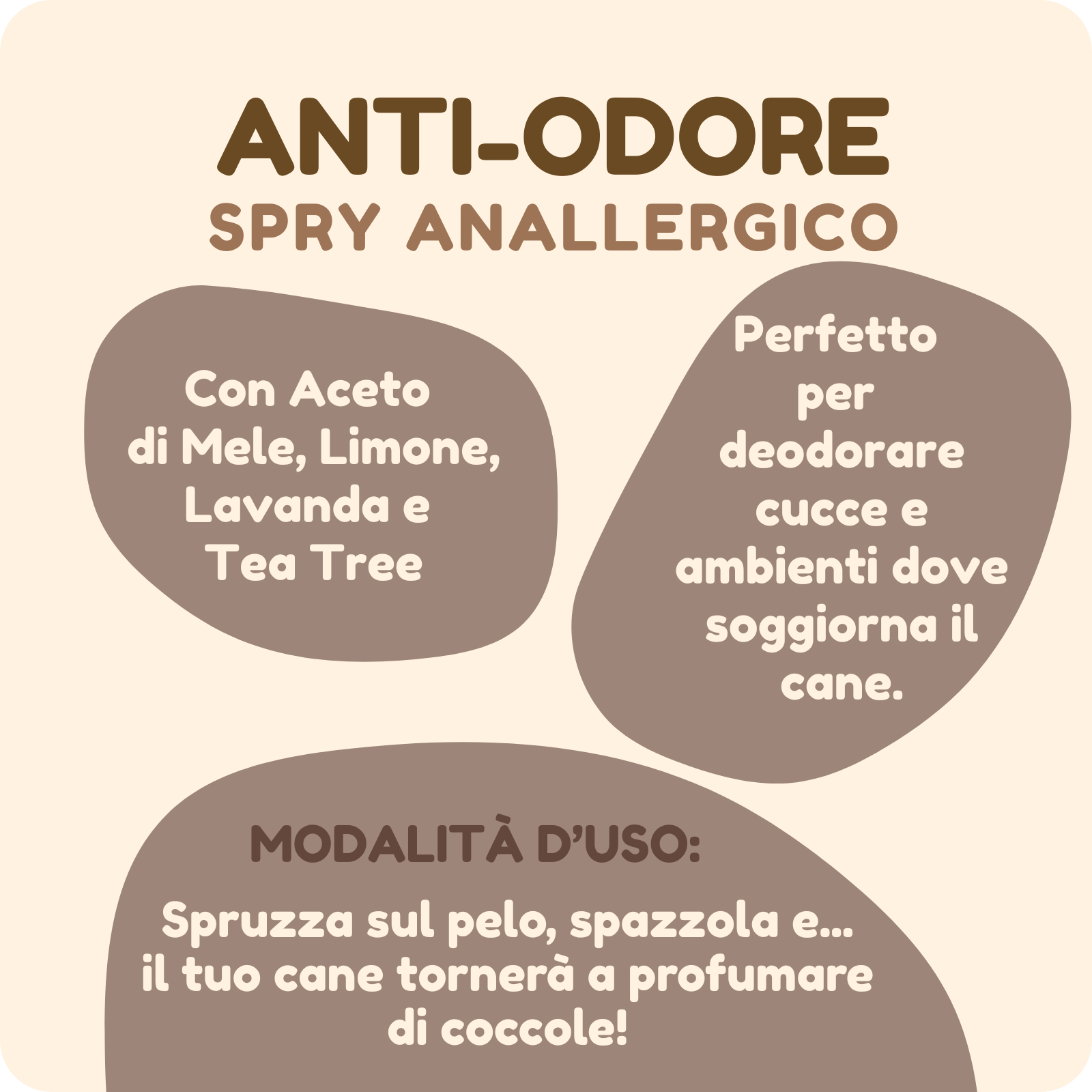 Spray Anti odore anallergico e delicato, adatto anche ai cuccioli, da utilizzare sul pelo o anche per deodorare cucce ed ambienti dove soggiornano i vostri cani.